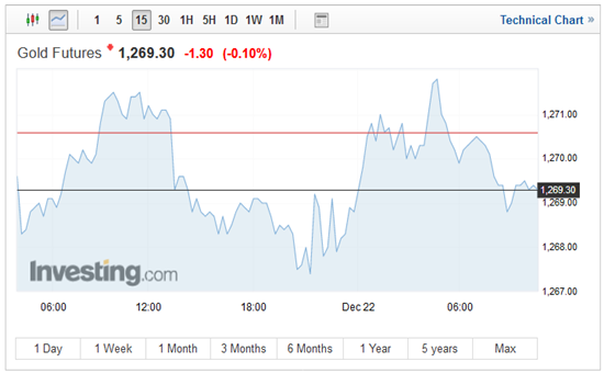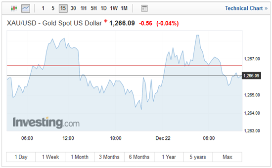 国际现货黄金周四(12月21日)亚市早盘开于1265.45美元/盎司,最低下探1263.20美元/盎司,最高上涨至1268.99美元/盎司,收于1266.65美元/盎司,上涨1.2美元,涨幅0.09%。