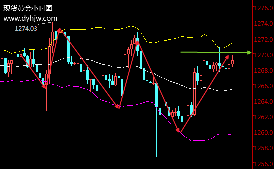 从目前黄金走势上看,在小时图中,黄金价格受到隔夜利好的影响,在站稳1268美元后,目前涨势还有进一步扩大的趋势,布林带三轨再次呈现喇叭口扩张的形态,更主要的是,黄金重新回到1265-1270的多头震荡区间,这给后市突破1270大大减少了压力,如果今晚非农数据能够利好黄金,那么突破1270基本没有任何疑虑。