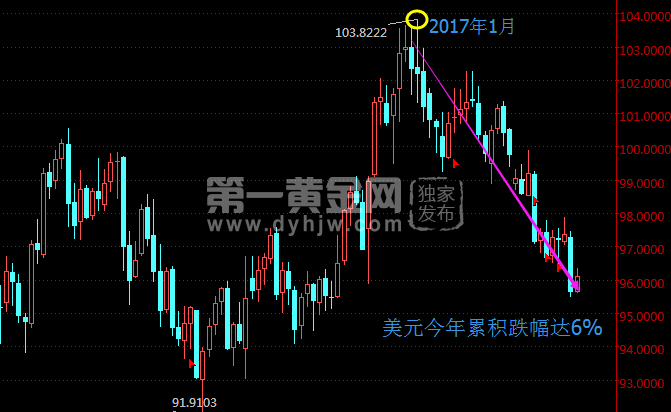 只不过2016年6月受到英国脱欧公决投票通过的刺激,金价得以再上一层楼;而今年6月不但没有利好,而且由于美联储今年第二次升息之外,坚持要在今年继续升息,还要缩减资金负债平衡表,货币政策的进一步紧缩给金价带来了压力,进入6月份后金价开始下跌。