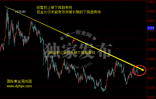 上图中的这条长期下降趋势线的高点在2011年所达到的1921.17美元/盎司附近。虽然当时价格在2011年月初的时候大幅上涨,但这一涨势却并未持续。