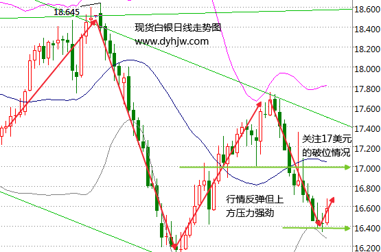 就目前白银走势图上看,白银价格在16.40美元处出现止跌反弹,但布林带三轨目前仍然处于向外发散的状态,中轨即将下破17美元,整体下跌的趋势依然没变,除非行情能够站稳在17美元关口上方。但当下白银价格距离17美元仍然有较大的差距。