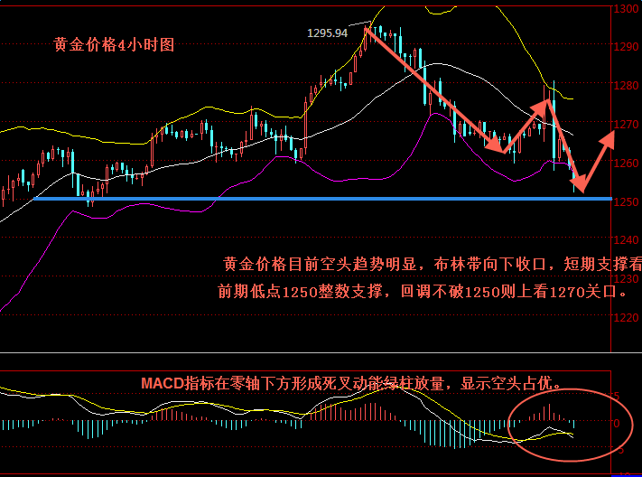 黄金价格日内行情来看,目前黄金价格已经跌破1260一线,这是晚间初请数据好于预期的原因,技术指标布林带收口向下,MACD零轴下方形成死叉下行,KDJ三线拐头向下,整体趋势偏空。下方强支撑力在1250-1252一线支撑,进一步支撑位在1246一线,上方日内重点关注的依然是1263-1265一线阻力情况,这是日内首个可以考虑空单的点位,其次就是1268附近。