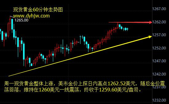 国际现货黄金周一(5月22日)亚市早盘开于1257.11美元/盎司后,金价开始下挫,录得日内低点1254.37美元/盎司后转升,动能强劲。欧市金价连续上涨,突破1260美元一线后在度上攻,触及日内高点1262.52美元。美市空头发力,金价震荡回落,维持在1260美元一线震荡,终收于1259.60美元/盎司。