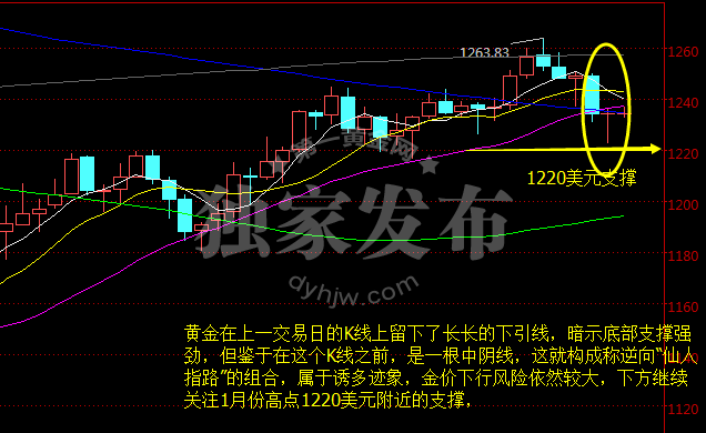 技术面:警惕诱多风险日线级别,现货黄金在上一交易日的K线上留下了长长的下引线,暗示底部支撑强劲,但鉴于在这个K线之前,是一根中阴线,这就构成称逆向“仙人指路”的组合,属于诱多迹象,金价下行风险依然较大,下方继续关注1月份高点1220美元附近的支撑,一旦该位置失守,金价或进一步下探1200美元整数关口的支撑。上方则关MA5日均线1240美元附近的阻力,强阻力看向MA10日均线1243美元。