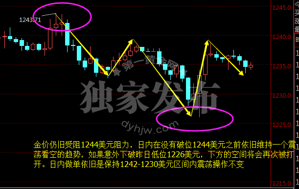 国际市场上,金价仍旧受阻1244美元阻力,周二金价并未下行太多而是重回1230美元上方。由于会议纪要即将到来,日内在没有破位1244美元之前依旧维持一个震荡看空的趋势,如果意外下破昨日低位1226美元,下方的空间将会再次被打开。日内做单依旧是保持1242-1230美元区间内震荡操作不变。