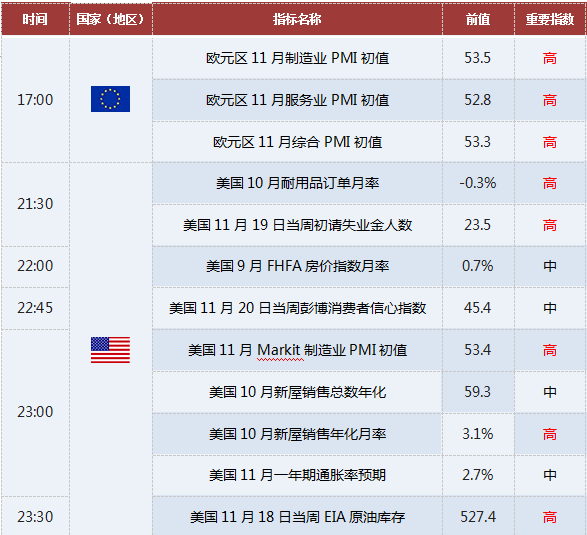 日内各大市场各时段重点关注:欧洲时段,市场迎来欧元区一系列的Markit制造业PMI数据,这些数据的表现也会给欧元的走势带来重要的指引。