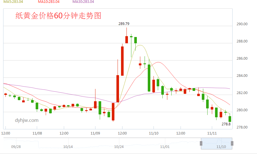 第一黄金网11月11日讯,中国银行纸黄金今日价格目前报价276.32元/克。金价跌破1260关口创两周最低收盘,美元指数升至10月25日来最高水平。欧洲掀起实物金购买热潮美国金市冷淡, 印度的黄金零售价飙升了15-20%。