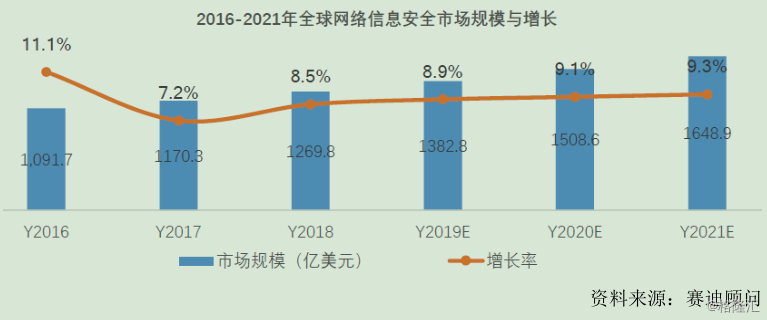 近年来,随着互联网、大数据、云计算、物联网等新技术的应用,大规模数据泄露、高危漏洞、网络攻击等网络信息安全问题也日益严峻。根据赛迪顾问的数据显示,2018 年全球网络信息安全市场规模达到 1,269.8 亿美元,较 2017 年增长 8.5%。赛迪顾问预测到 2021 年,全球网络信息安全市场将达到 1,648.9 亿美元。