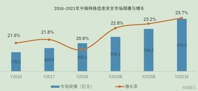 国内市场,根据赛迪顾问数据,2018 年市场整体规模达到 495.2 亿元,较 2017 年增长 20.9%,预测,到 2021 年我国网络信息安全市场将达到 926.8 亿元,增长率远超全球安全市场整体增长率。