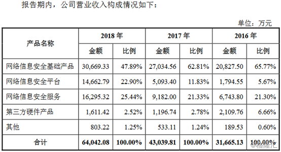 截至2016至2018年,公司实现营收分别为3.17亿元、4.3亿元及6.4亿元。其中,网络信息安全基础产品系公司近三年来主要营收贡献业务,虽占主营比例从2016年的65.77%降至2018年的47.89%,但仍为公司主营主导业务。