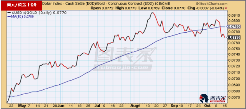 美元需求开始逆转的另一个迹象可以从美元/黄金比率中得出。该比率是衡量投资者是否应该持有现金而非黄金的一个有效的指标。过去几个月,这一指标表明,持有美元是明智之举,黄金应该被避开。然而,最新的证据表明,美元/黄金比率正在逆转,在短期内有利于持有黄金。分析师特别指出,若美元/黄金比率收于50日移动均线下方,对近期金价来说将是个好兆头。