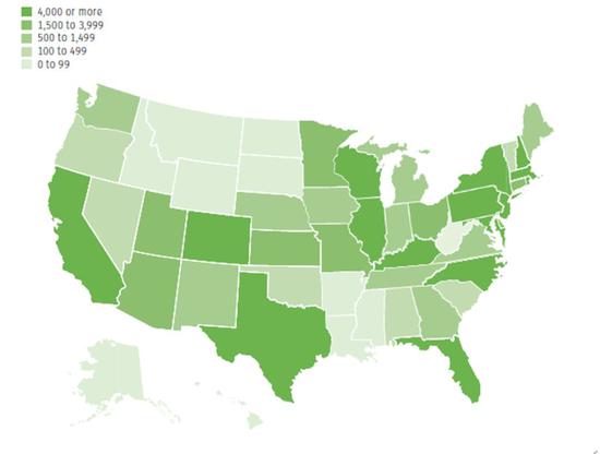 对许多行业而言,在行业兴起的地方从业人员往往较为集中。这一点对投资公司同样适用。投资公司运营的早期主要以马萨诸塞州、纽约为中心区域(图2.18),23%的基金从业人员在此工作。随着行业的发展扩张,其他如加利福尼亚州、宾夕法尼亚州和德克萨斯州,也开始成为主要的基金从业人员聚集地。截至2017年3月,上述三个州的基金公司雇佣了四分之一的基金从业人员。