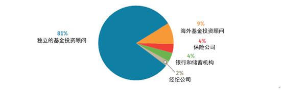 在美国,有众多金融服务机构提供注册基金产品。截止2018年底,全部基金管理主体(fundcomplexes)中,81%为独立的基金投资顾问,共管理着70%的基金资产。除独立基金投顾机构外,其他管理主体还包括海外基金投资顾问、保险公司、银行、储蓄机构和经纪公司(图2.9)。