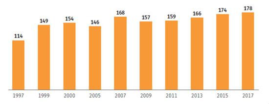基金发起人和第三方服务商为基金及其投资者提供咨询、记录保留、行政、监管以及其他相关服务。在美国,随着基金数量和规模不断扩大,基金行业的从业人数自1997年以来增长了56%,从11.4万人增长到2017年的17.8万人(图2.16)。