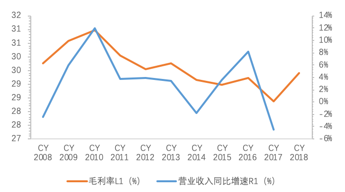 必需消费品(Consumer staples)囊括了beverage(饮料)、chemicals(化学制品)、Food staples retailing(食品零售)、Food products(食品制造业)、health care providers services(健康生产)和tobacco(烟草)八个子行业。从2010年以来的情况看,必需消费品行业营收增长缓慢,毛利率下降趋势明显,行业通过压缩费用维持净利润率水平。